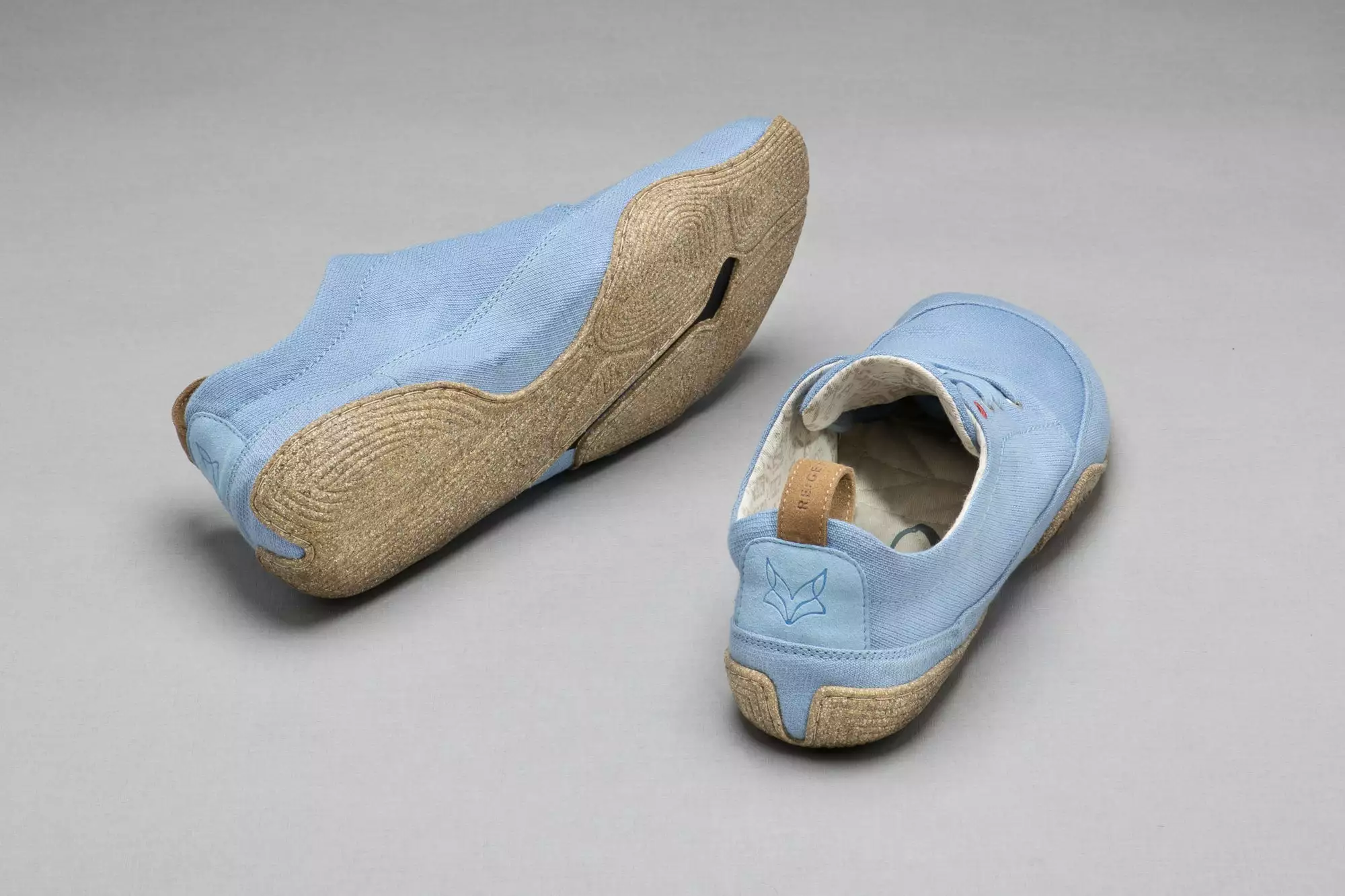Die Materialien des himmelblauen Oberstoffes stammen aus kontrolliert biologischem Anbau. Das Leinen wird aus Europa bezogen und sorgt mit einem Anteil von 33 % zudem für ein angenehmes Fußklima.