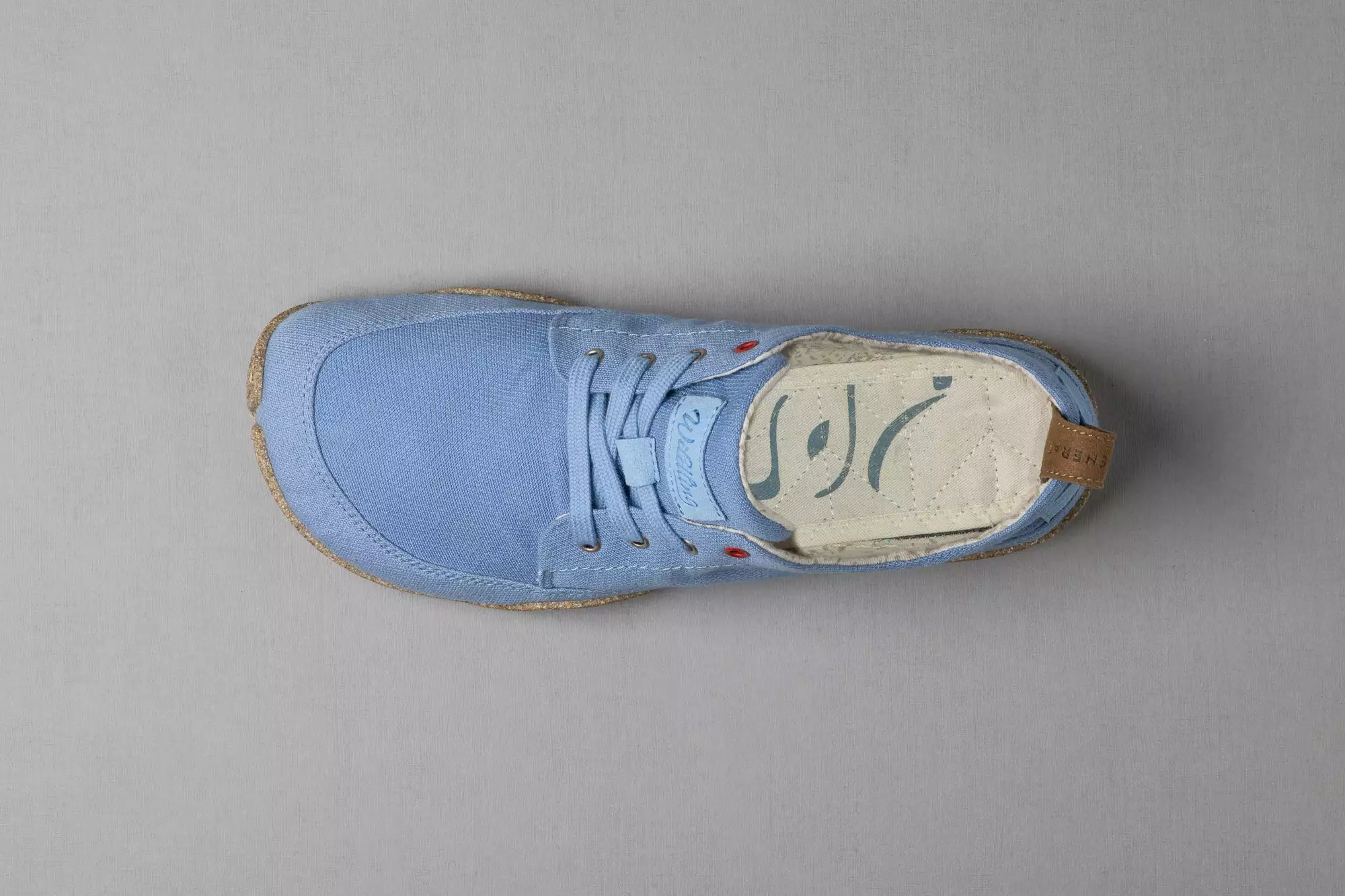 Nicht nur das Obermaterial, sondern auch der Ringbesatz dieses Minimalschuhs ist aus Baumwoll-Leinen-Gemisch gefertigt und erlaubt es uns, Mikrofaser einzusparen. Das strahlende Blau hat dabei seinen Namen inspiriert, denn Kul ist Kirgisisch und bedeutet See.