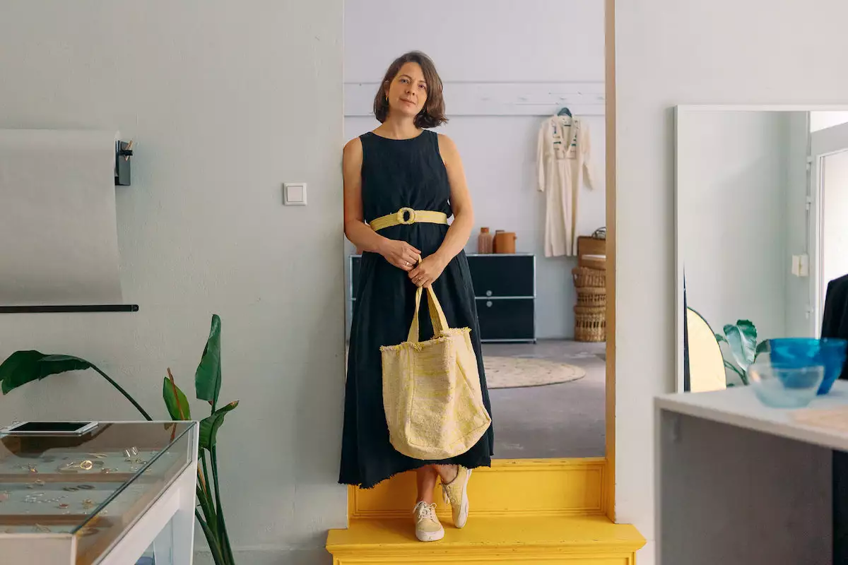 Die Baumwolle wird mit Kurkuma gefärbt und Essig fixiert. Durch diese natürliche Verarbeitung ohne Einsatz von Chemikalien bleicht der Stoff bei Sonneneinstrahlung schneller aus.