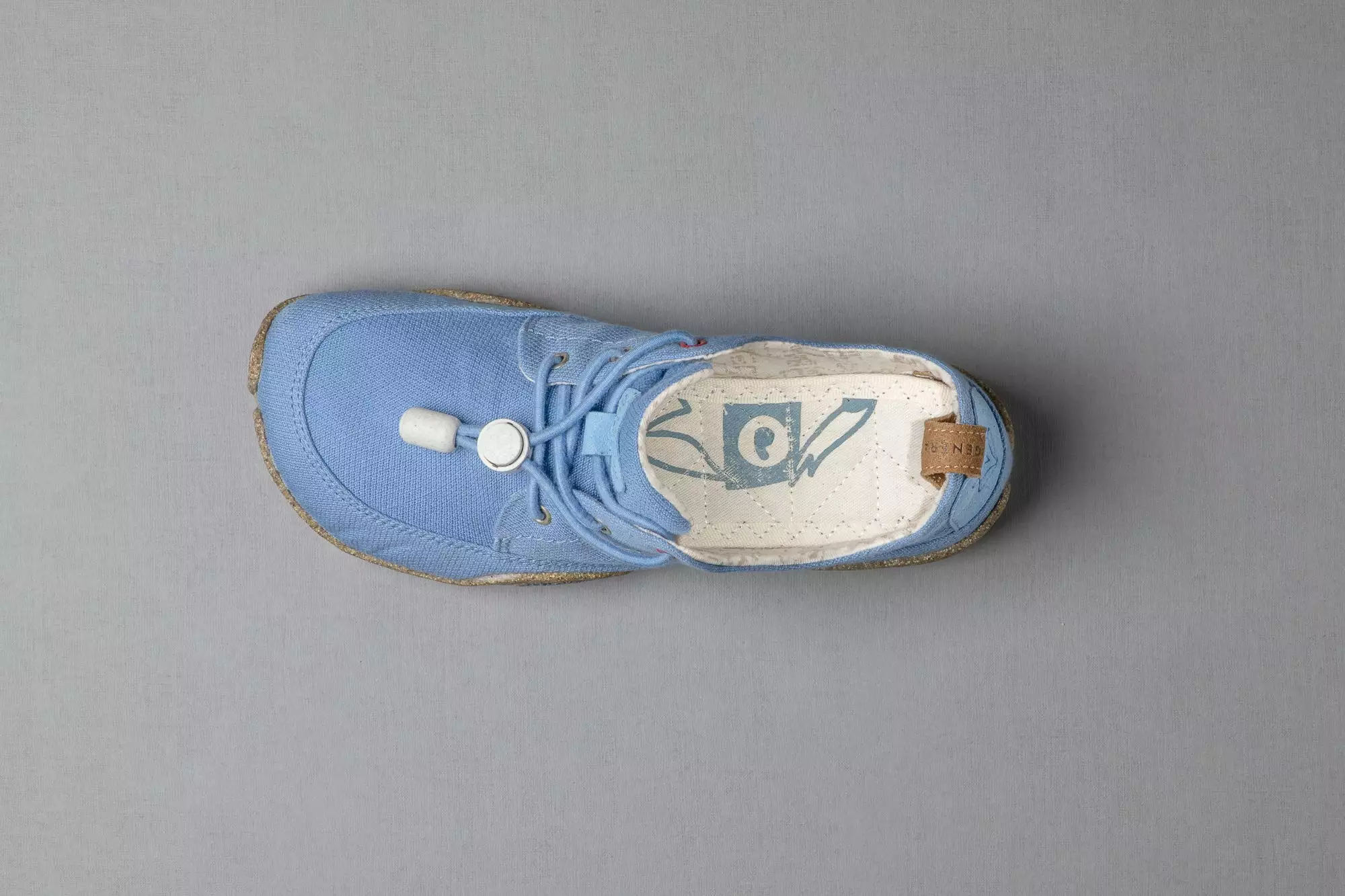 Nicht nur das Obermaterial, sondern auch der Ringbesatz dieses Minimalschuhs ist aus Baumwoll-Leinen-Gemisch gefertigt und erlaubt es uns, Mikrofaser einzusparen. Das strahlende Blau hat dabei seinen Namen inspiriert, denn Kul ist Kirgisisch und bedeutet See.