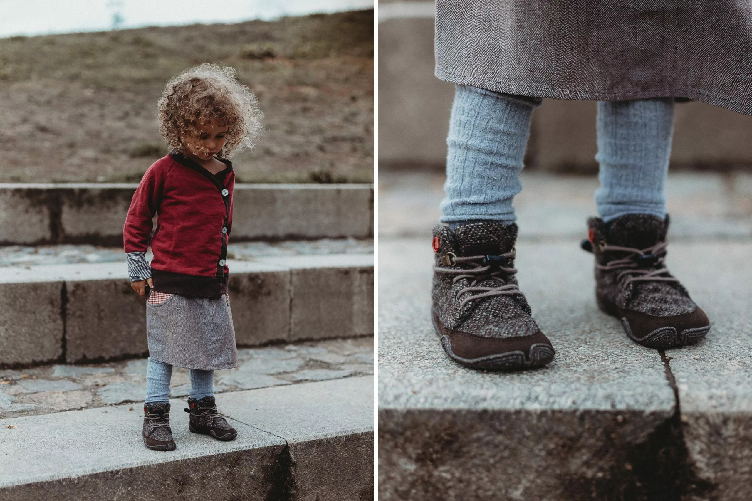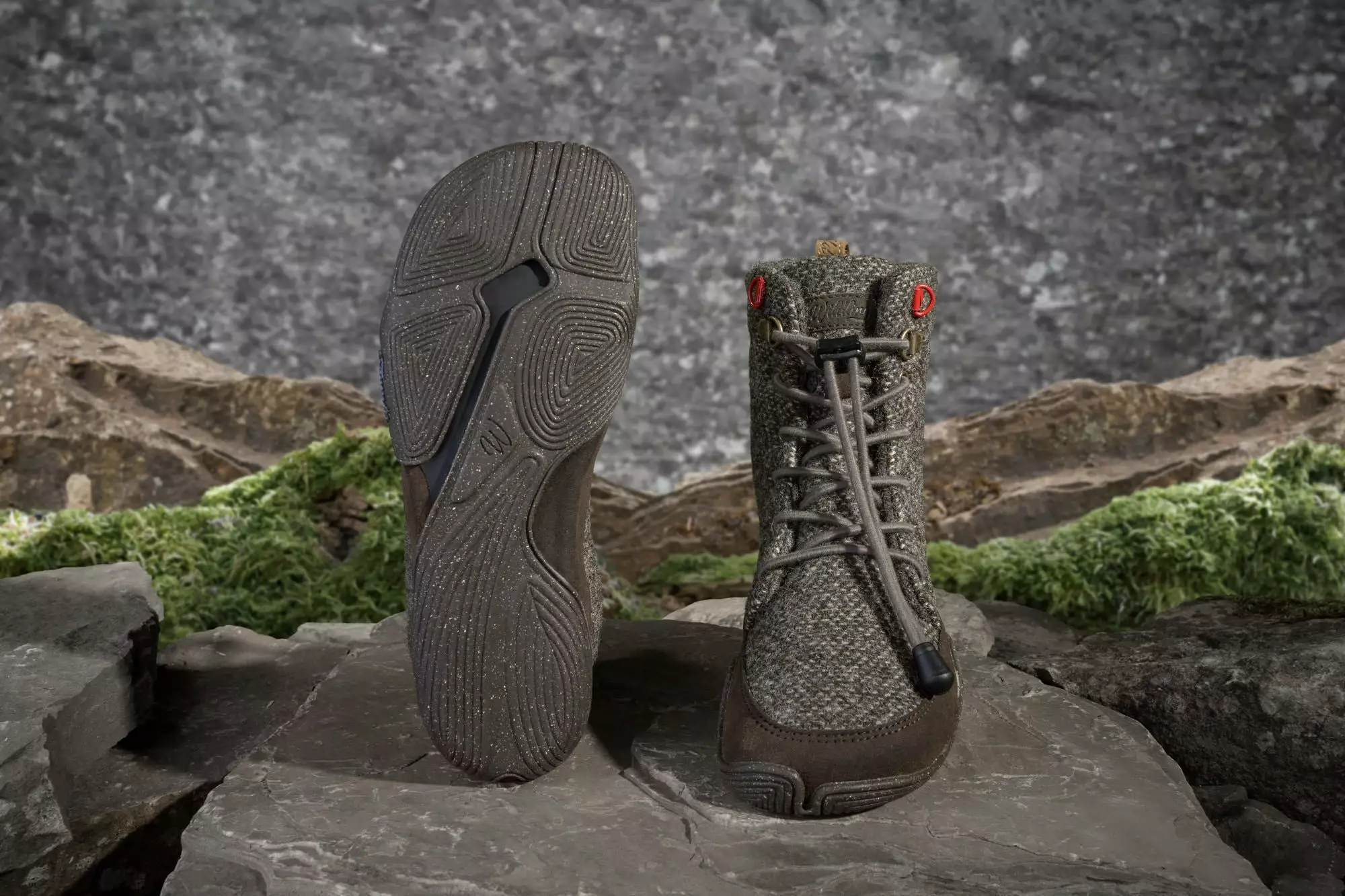Das High Cut Modell sorgt mit Schurwolle als Obermaterial und Innenfutter für wohlig warme Füße auch an kalten Tagen. Durch die dichte Leinwandbindung des braun-beige melierten Oberstoffs von unserem Partner Nordwolle wird Kälte von außen abgehalten, während der Walkloden innen ein angenehmes Fußklima aufrechterhält.